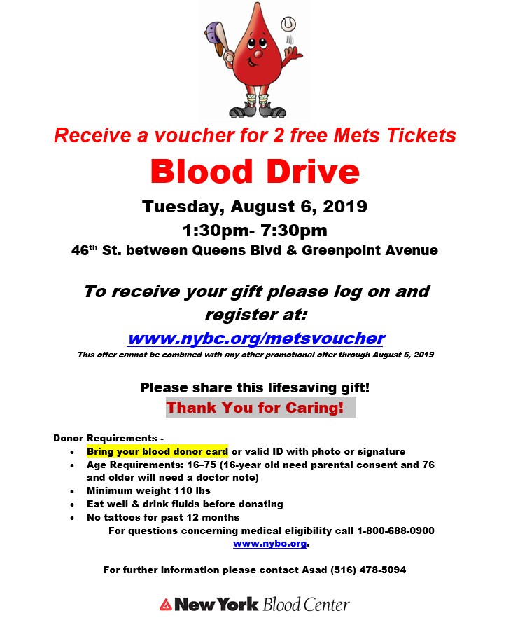 On Tuesday, Aug. 6 between 1:30 p.m. and 7:30 p.m. the New York Blood Center will be holding a blood drive on 46th Street between Queens Boulevard and Greenpoint Avenue.