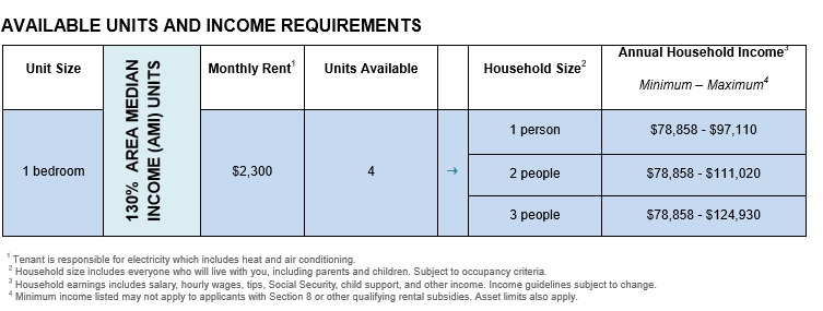 The units, all one-bedroom apartments, require applicants to have a minimum yearly income of $78,000 in order to qualify.