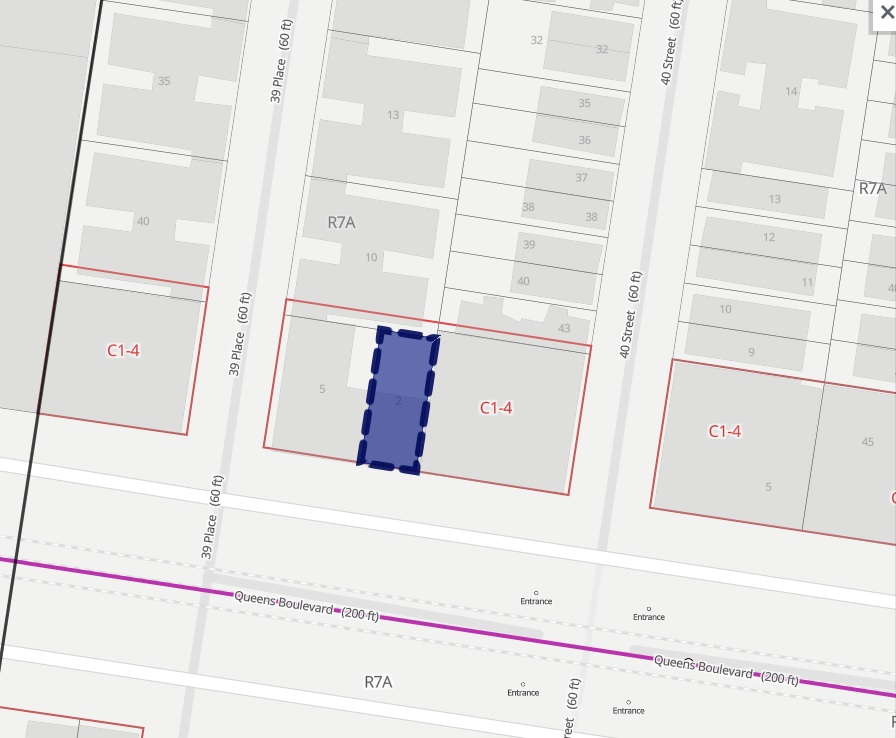 Plans have been filed for a 7-story, 23 unit building at 39-29 Queens Blvd (in purple). The site is next to the corner lot occupied by Dazies and several shuttered stores at Queens Blvd./40th St. (Map: City Planning). On the 39th Place side is Tangra, a restaurant, located at 39-23 Queens Blvd.