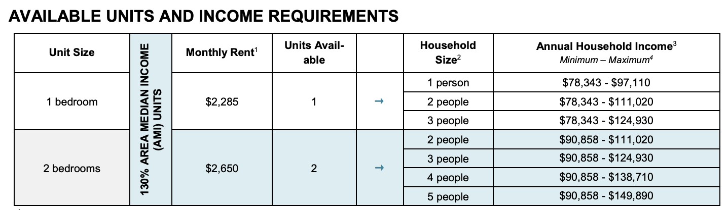 The one-bedroom unit is available to households of one, two or three people and costs $2,285 a month. Applicants must make at least $78,343 annually and at most $124,930 for an annual combined household income of three people to qualify for the one-bedroom unit.