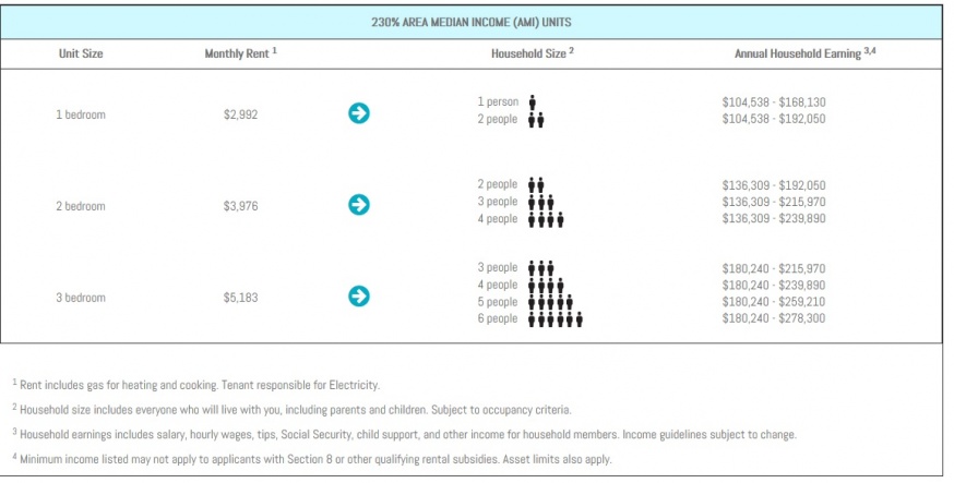 Individuals looking to rent a one-bedroom apartment must have a yearly income ranging between $104,538 and $168,130, while a two-person household can make no more than $192,050 a year. One-bedroom apartments go for $2,992 a month.