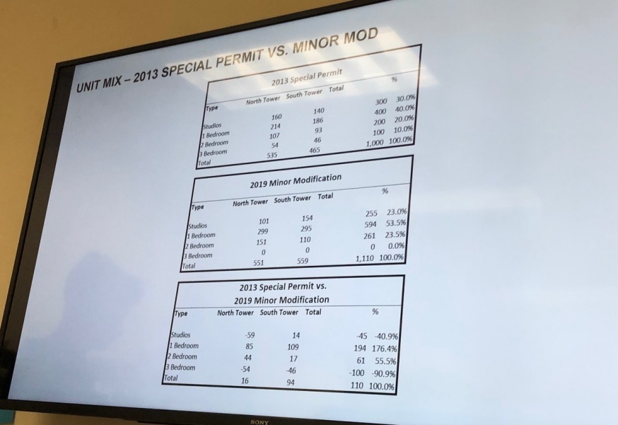 The committee was caught by surprise that the initial 1,000-unit plan–that included 100 units allocated for 3 bedrooms–had changed. The new plan presented at the meeting noted that there would 1,122 units–with no 3 bedrooms. A chart was displayed at the meeting (see photo).