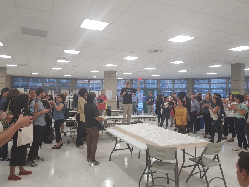 Several speakers climbed onto the cafeteria tables and addressed the watching crowd. One speaker claimed that the EDC community meetings “are fake,” while a number of speakers said that Sunnyside Yard would become just another Hudson Yards.