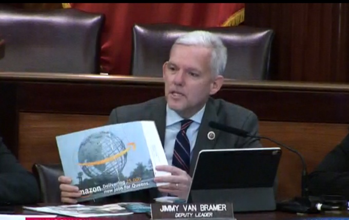 Council Member Jimmy Van Bramer at an Amazon oversight hearing in January, when he denounced the deal (City Council)