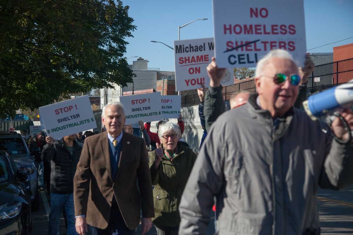 Hundreds of protesters, equipped with signs that depicted the mayor as an evil emperor and “shelter industrialist,” filled both sides of Cooper Avenue at the underpass between 74th and 79th Streets on Nov. 2 to the near-constant sound of cars honking their horns.