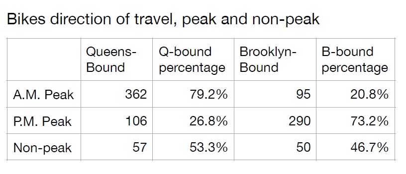 The study found that the majority of the cyclists crossing the bridge come from Brooklyn. During peak morning hours 80 percent of cyclists on the bridge were riding into Queens. In the evenings, 75 percent of cyclists were riding from Queens into Brooklyn.
