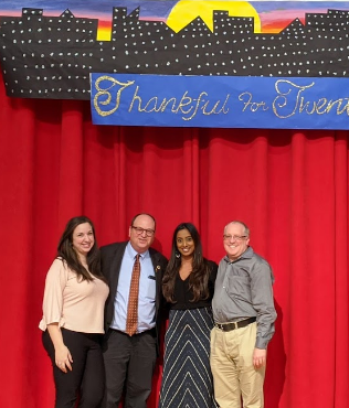 Special guest Councilman Barry Grodenchik, COMPASS employees and Assistant Director Shiva Sharma showcased a special performance under a sign that read, “Thankful for Twenty.”