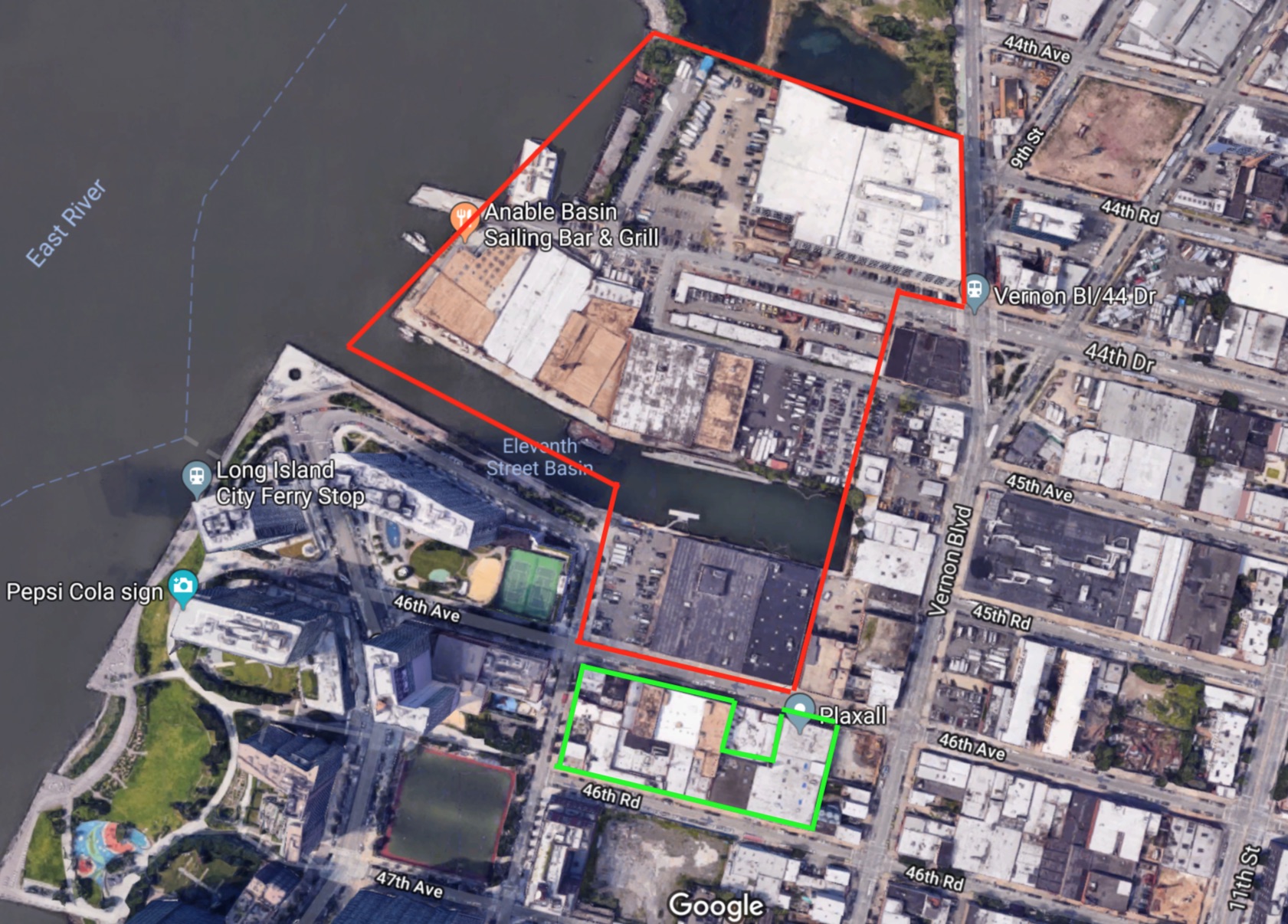 The sites that would have made up the General Project Plan as part of Amazon’s headquarters project. Amazon planned to build over the sites outlined in red. The site outlined in green, known as “block c” would have moved through the upzoning process despite not being part of Amazon’s headquarters. (Google Maps)