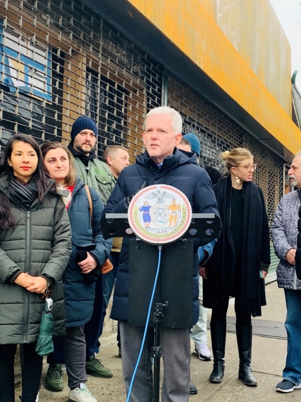 Council Member Jimmy Van Bramer holds a press conference in Sunnyside Friday to rally for a commercial rent control bill (Photo: Courtesy of CM Van Bramer’s office)