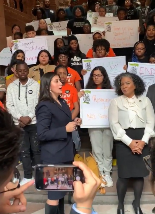 State Senator Jessica Ramos rallied alongside advocates in Albany Monday to urge state lawmakers to pass a bill that would limit suspensions in public schools.