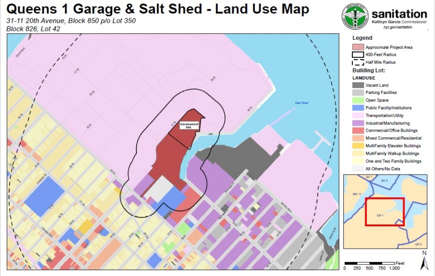 The application involves the construction of a 93,775 square foot garage at 31-11 20th Ave, which would be used to house vehicles and equipment for refuse and recycling collection, street cleaning, and winter emergency operations.