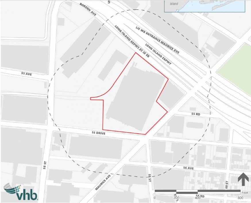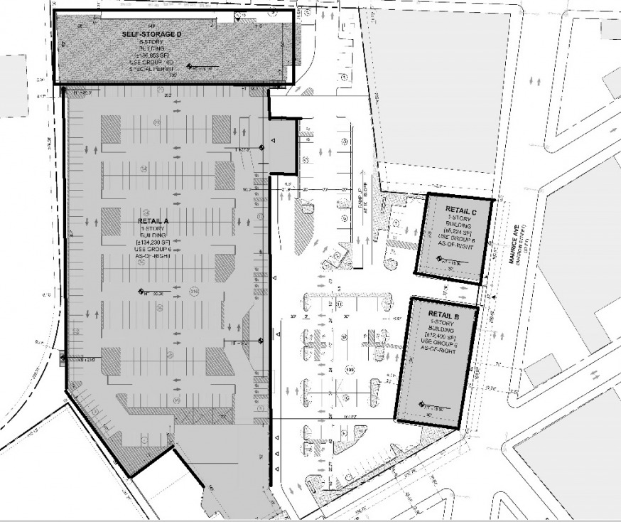 The development site is bound by Borden Avenue to the north, 55th Drive to the south and Maurice Avenue to the east. The self-storage facility would be located to the rear of the site—by the Long Island Expressway– and adjacent to the proposed 134,000 square foot Home Depot store. The two one-story retail buildings would front onto Maurice Avenue.