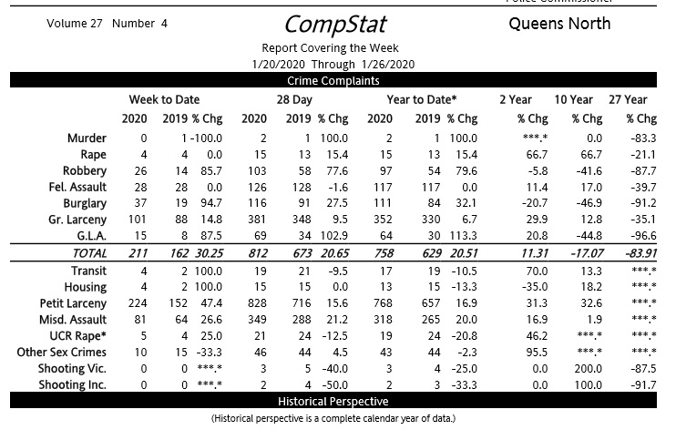 There were 758 serious crimes from Jan. 1 through Jan. 26, 2020 in Queens North; up from 629 during the same period in 2019, according to NYPD data.