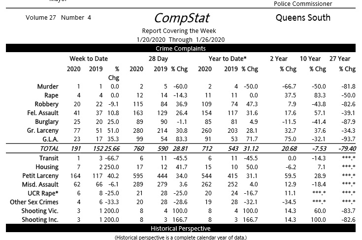 Likewise, robberies rose 47 percent and auto thefts swelled 71 percent last month (ending on Jan. 26) in Patrol Borough Queens South — which includes the 100th, 101st, 102nd, 103rd, 105th, 106th, 107th, and 113th precincts — from the same January period last year. There were 109 robberies and 91 auto thefts during the first 26 days of January, compared to 74 and 53 respectively for the same period in 2019.