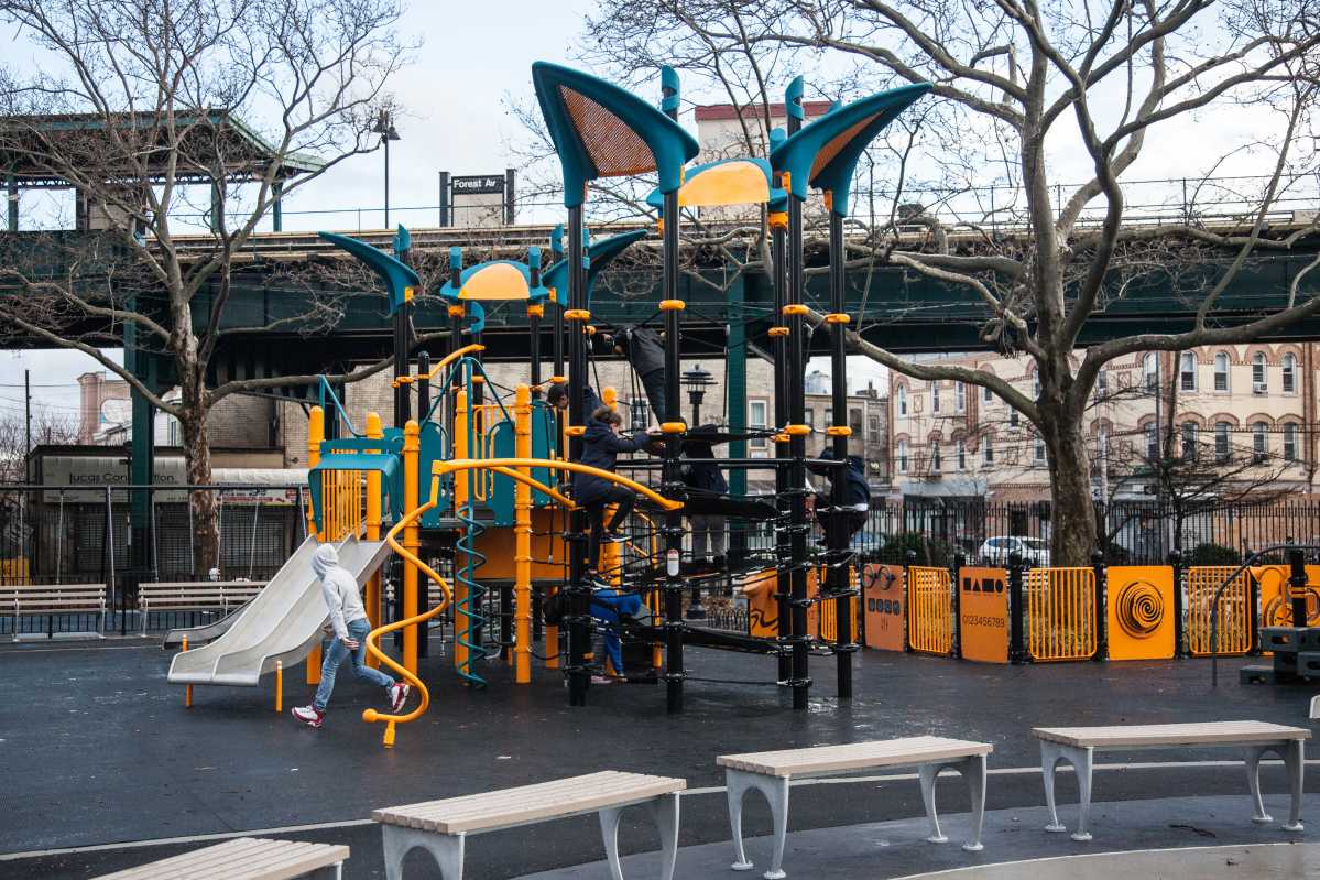 When the gates came up around Rosemary’s Playground earlier than scheduled, Ridgewood youth couldn’t resist the damp winter weather to try out the new playscape.