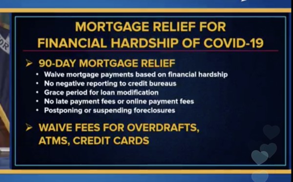 His plan will waive mortgage payments for 90 days for individuals facing financial hardships — such as a loss of full-time employment — with no negative effects to credit scores. There will also be no late payment or online payment fees and all foreclosures will be postponed or suspended, Cuomo said.