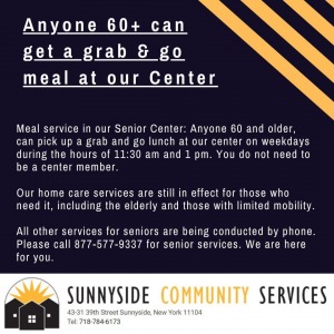 “We know getting groceries is challenging right now so if there is someone 60 and over who needs a meal, please come to our center,” said Judy Zangwill, Executive Director, Sunnyside Community Services.