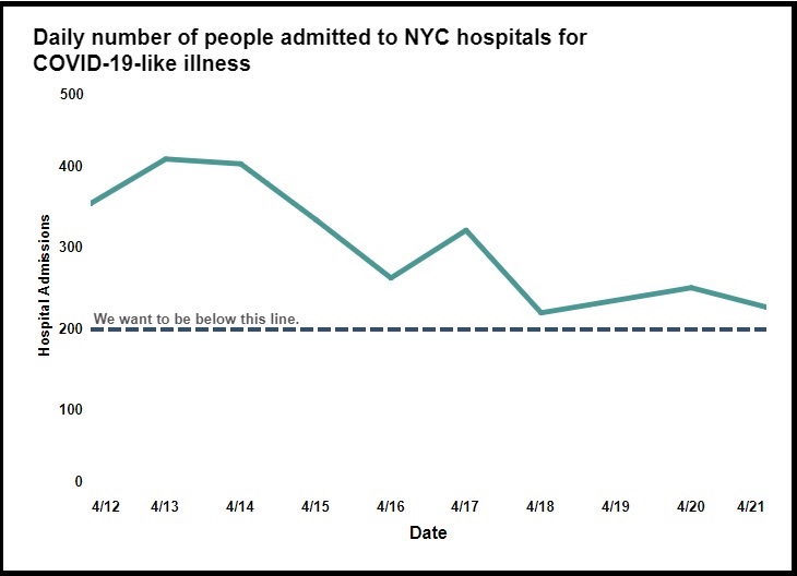 The daily number of COVID-19 patients in ICUs at the city’s 11 public hospitals continues to drop. Yesterday, there were 796 patients being treated for the virus in the intensive care units at public hospitals. On April 14, there were 887 people in ICUs for coronavirus.