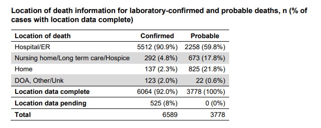 The Health Department also released information on the locations of the deaths. The vast majority of people died in the hospital, but a significant number died in their homes or in a nursing home, hospice care or similar facility, the data shows.