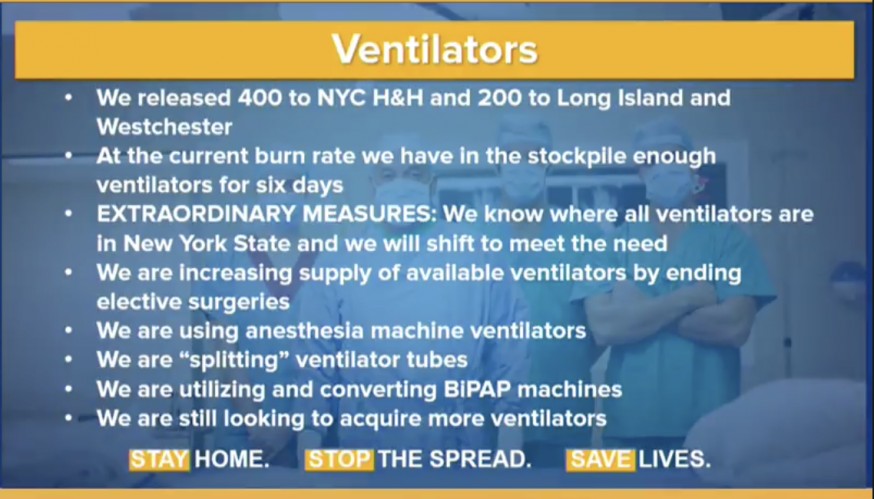 “Yes, the burn rate of ventilators is troubling and six days of ventilators in the stock pile is troubling, but we have all these extraordinary measures that I believe, if push comes to shove, will put us in fairly good shape,” Cuomo said yesterday.