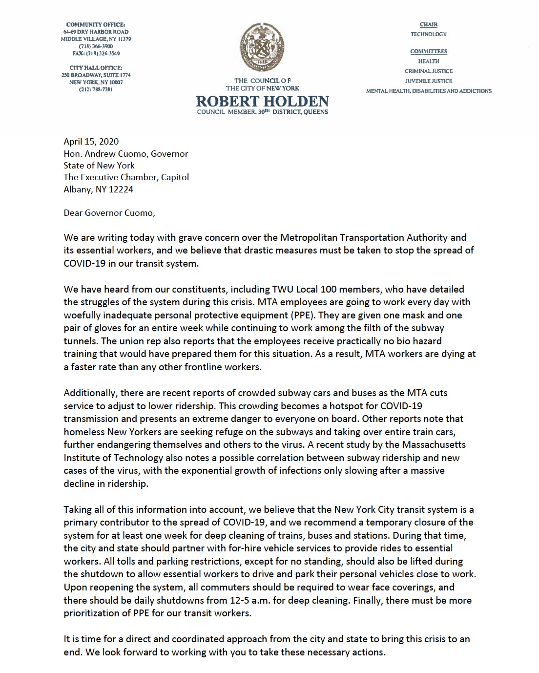 “We believe that the New York City transit system is a primary contributor to the spread of COVID-19,” Holden wrote in the letter.