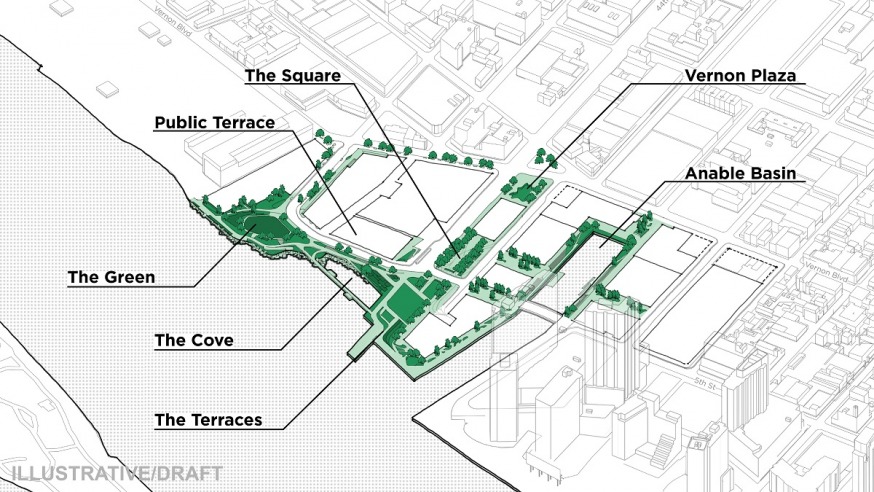 The plan includes 7 acres of open space, space for three schools and ½ million square feet for arts and cultural space and similar uses. The plan would also include a pedestrian/bicyclist bridge over Anable Basin that would connect 5th Street on both sides of the water.