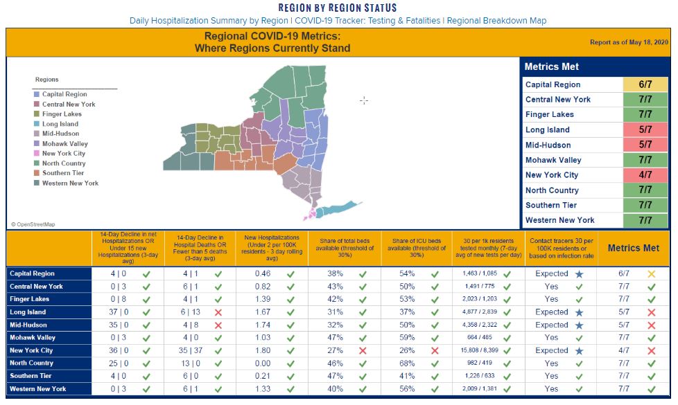 Albany and the Capital Region will begin reopening their economies from Wednesday, May 20, having met the state’s seven health-related requirements, he said. They will join Central New York, North Country, Finger Lakes, Southern Tier, and Mohawk Valley. The Western New York region began its re-opening phase on Tuesday.