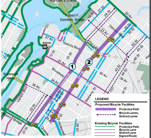 The agency also has plans to construct a protected bicycle lane on 31st Street—under the N/W elevated line—from 20th Avenue to 39th Avenue. However, priority has been given to Crescent Street, which can be implemented much faster and involves fewer resources.