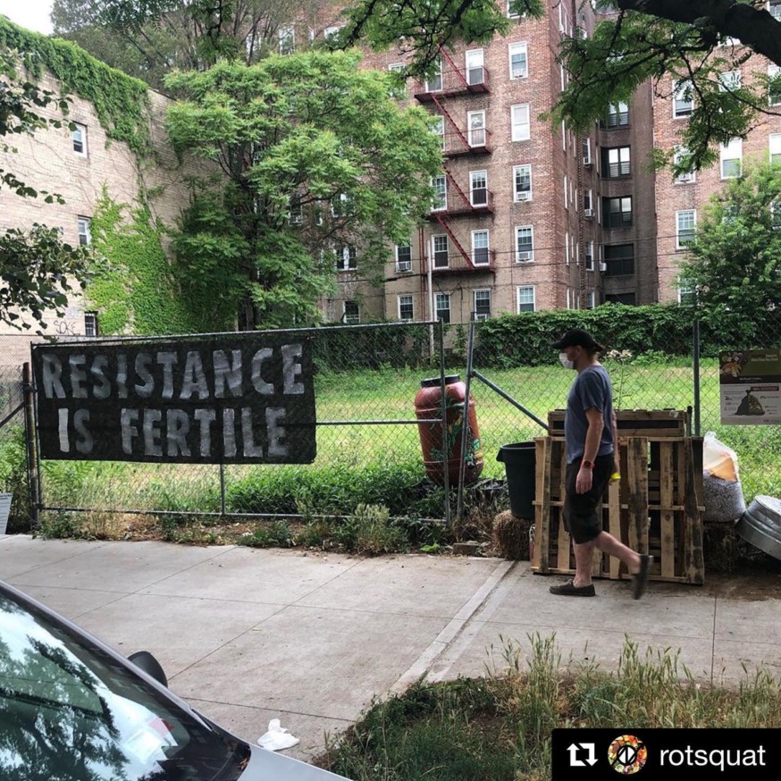 The Western Queens Guerrilla Gardeners — a group of local gardeners, environmental activists and community composters — transformed the vacant lot with new plantings, compost piles and a “Resistance is fertile” sign.