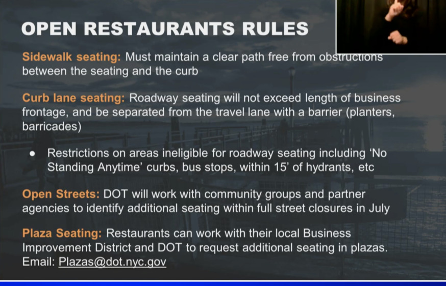 Restaurants will be able to take advantage of a variety of options, including sidewalks seating, parking space seating, open streets seating and pedestrian plaza seating.