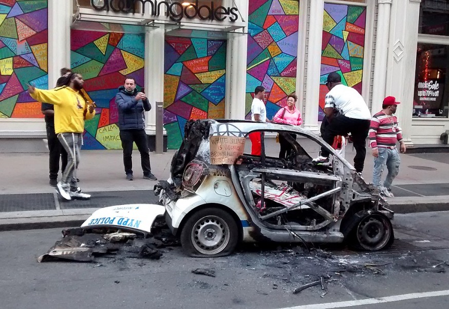 A burnt NYPD vehicle remains on a Manhattan street after New Yorkers protested the death of George Floyd at the hands of a Minneapolis police officer (Wikimedia Commons/ BlaueBlüte / CC0)