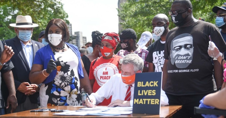 “I’m confident we can make these reforms work and continue strengthening the bond between police officers and our communities,” the mayor said while signing the legislation in the Bronx. De Blasio had joined activists to help paint “Black Lives Matter” along Morris Avenue shortly beforehand.