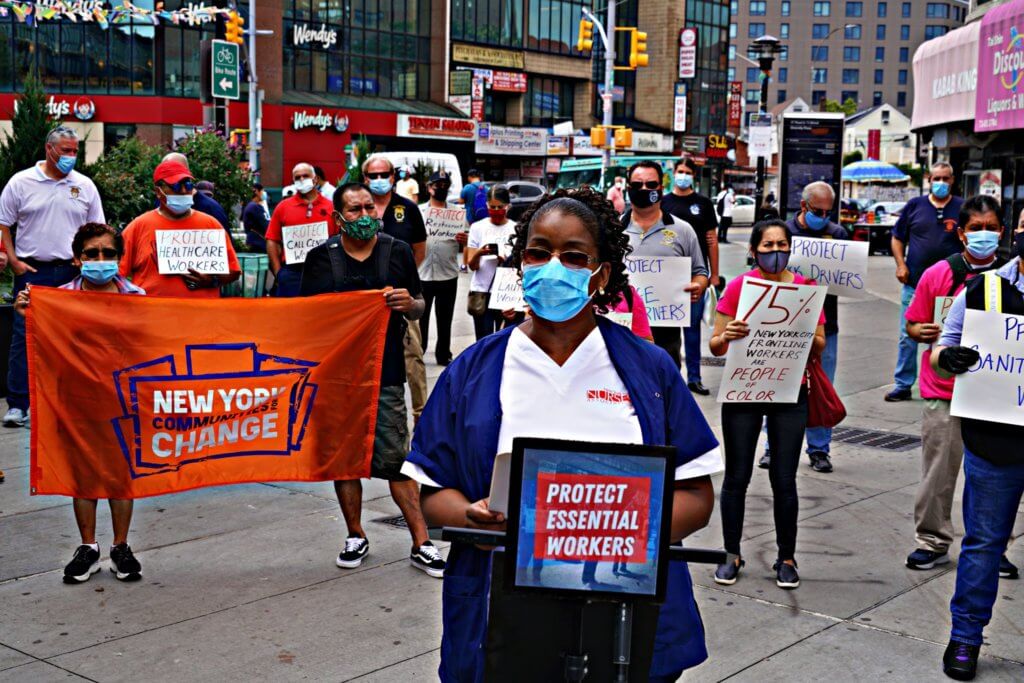 Essential workers rallied together at Diversity Plaza in Jackson Heights to call for state legislation that enforces personal protective equipment and other COVID-19 protection measures during the third phase of New York City’s reopening on Tuesday, July 7.
