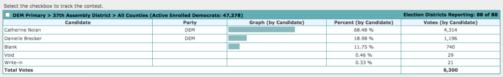 After the June 23 Democratic primary, longtime incumbent Catherine Nolan holds an early lead in the race for New York State Assembly District 37, over two challengers Mary Jobaida and Danielle Brecker.