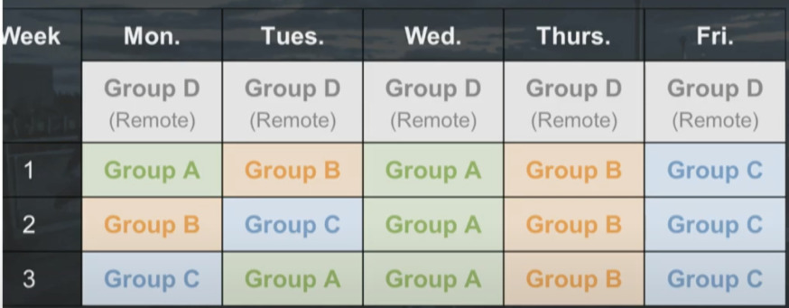Students who attend schools that can accommodate roughly one third of their student body under the guidelines will have classes one to two days a week on a rotating basis.
