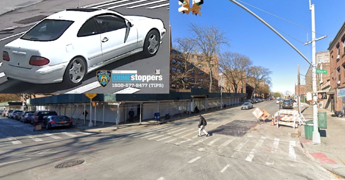 The white 2-door Mercedes Benz coupe and 8th Street facing north (NYPD and Google Maps)