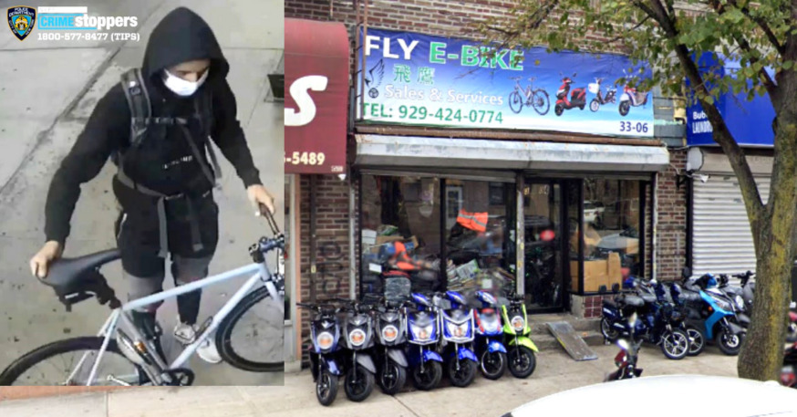 Police said the suspect entered Fly E-Bike, located at 33-06 28 Ave., on July 1 at around 12:30 p.m. before getting on an e-bike and riding it out of the store.
