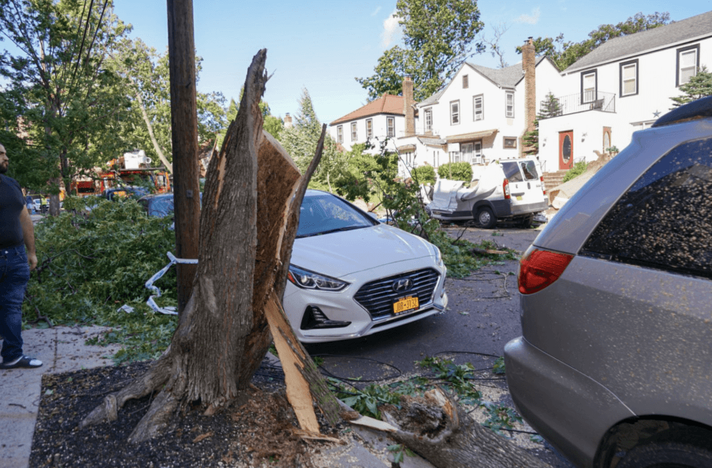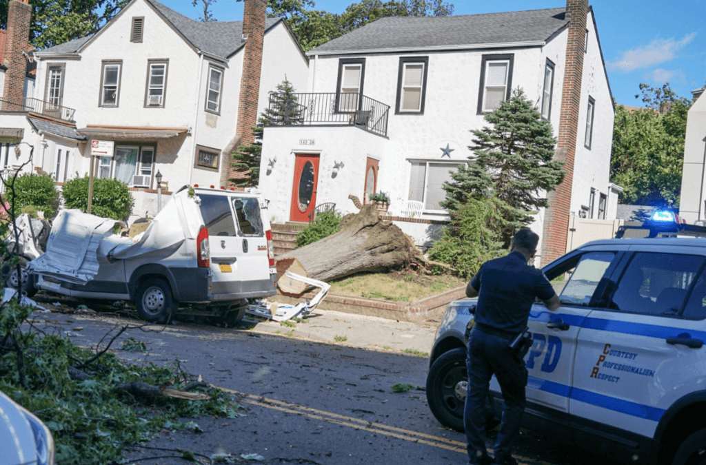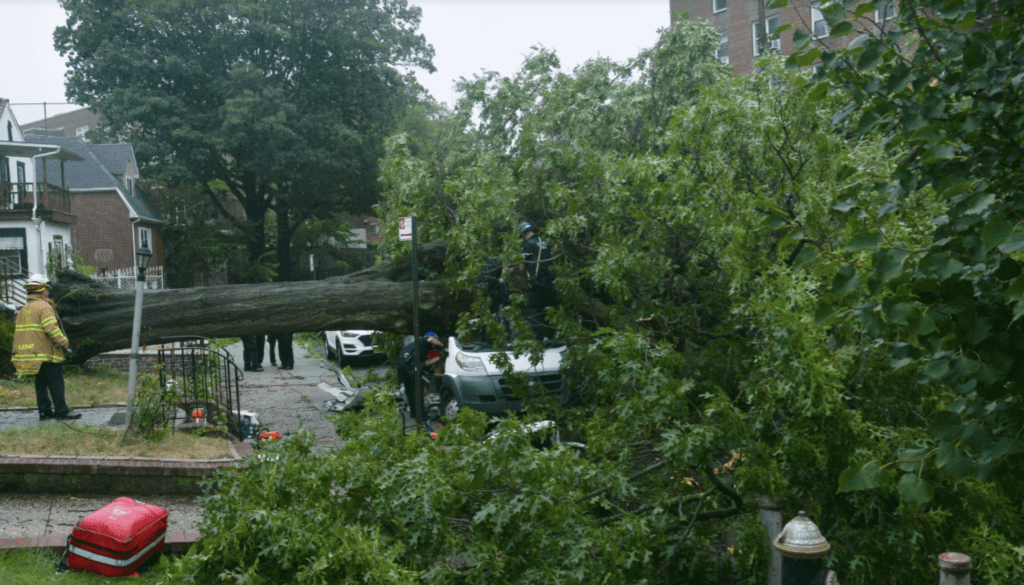 Fire officials say that FDNY personnel were called to 143-20 84th Dr. at 1:04 p.m. on Aug. 4 regarding a car that was hit by a tree. The incident occurred in the midst of Tropical Storm Isaias.