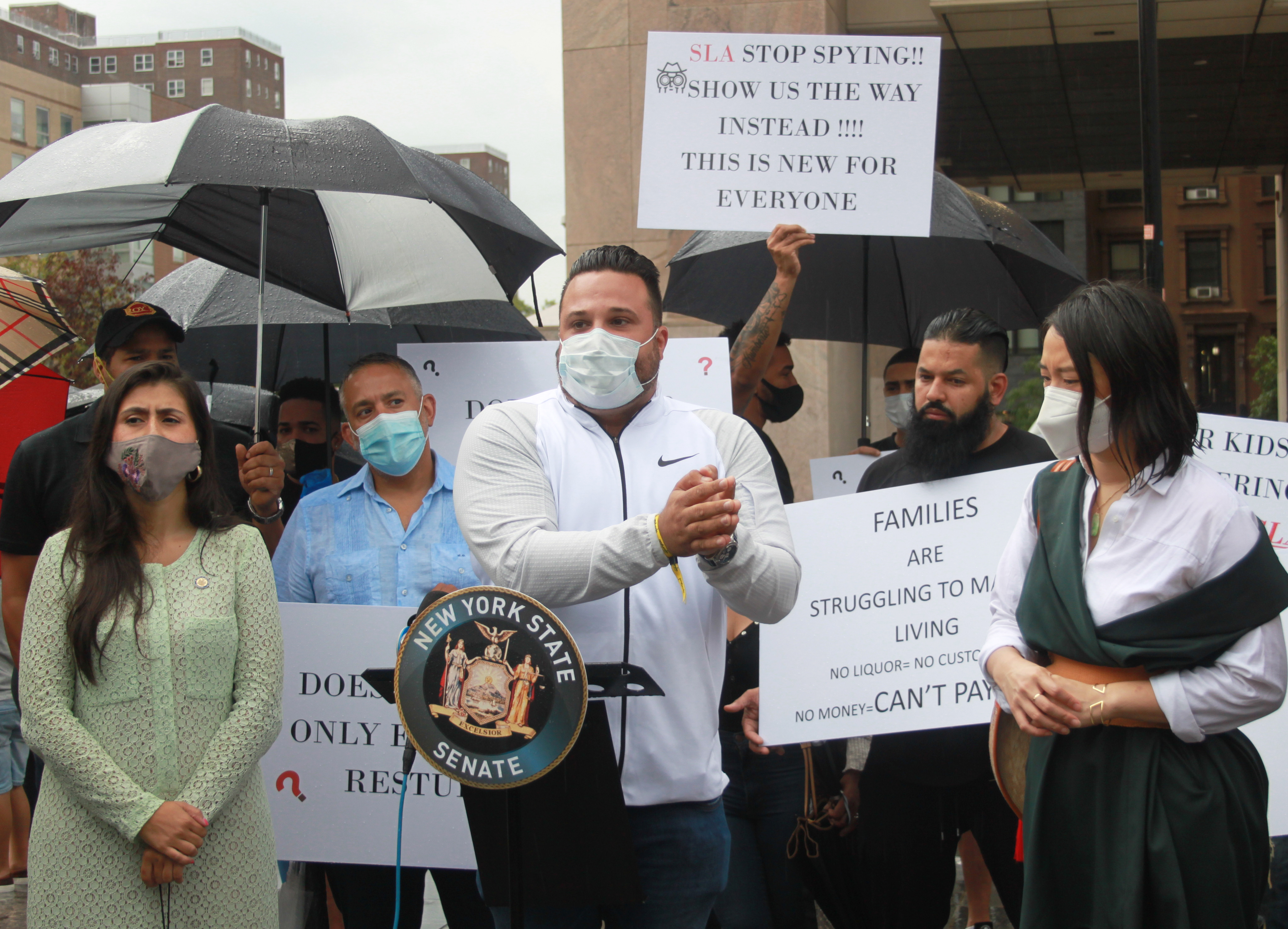 State Senator Jessica Ramos was joined by more than 30 Queens and Manhattan business owners who spoke out against what they say has been “excessive fining” and liquor license removals from the New York State Liquor Authority (SLA).