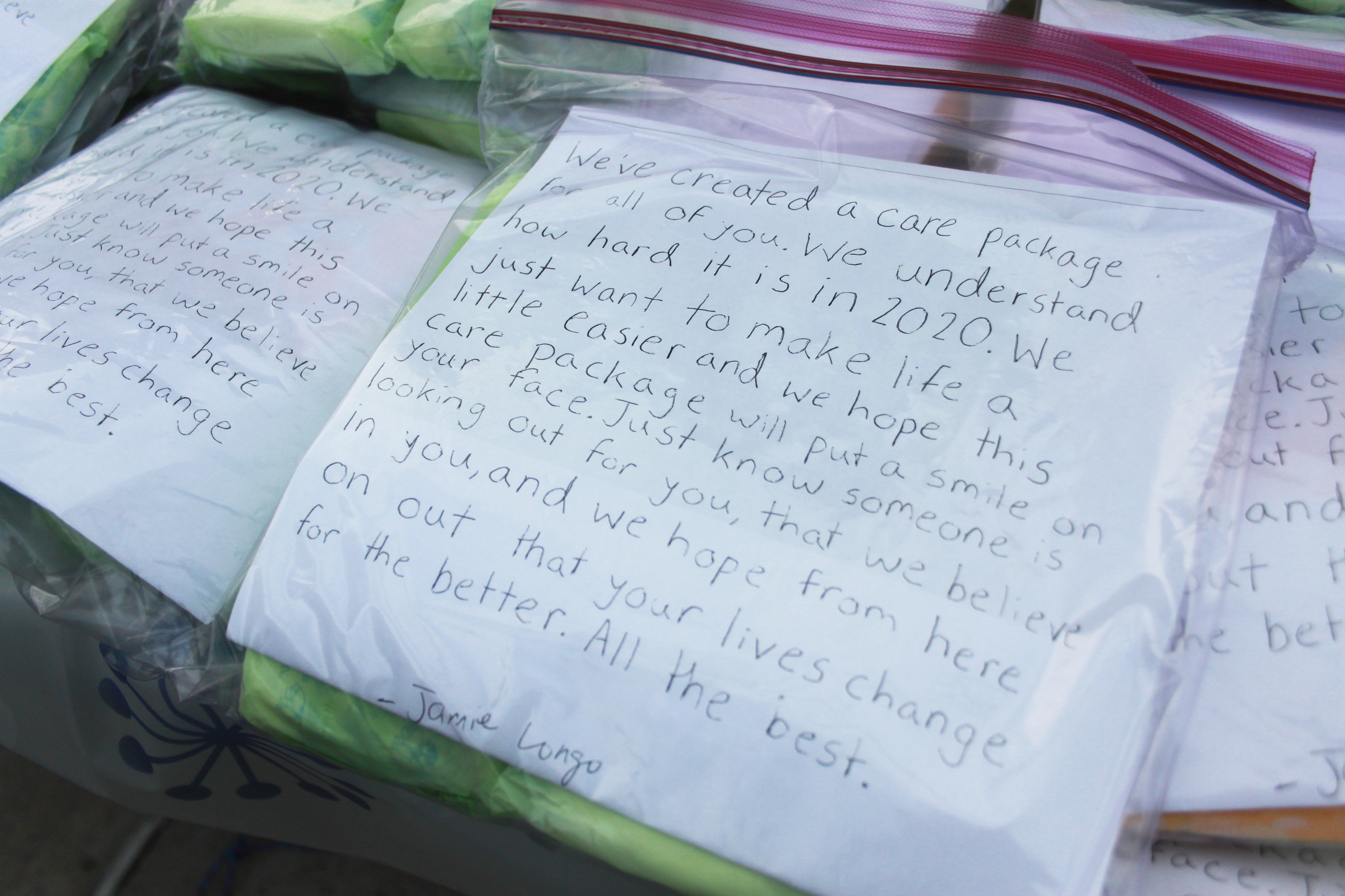 In the bags, they included a letter that read, in part, “We just want to make life a little easier and we hope this care package will put a smile on your face. Just know someone is looking out for you, that we believe in you, and we hope from here on out that your lives change for the better.”