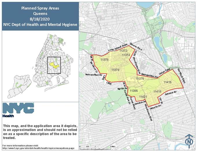 The New York City Department of Health will spray pesticides and adulticides to kill mosquitos and lower the risk of West Nile Virus transmission in several parts of Queens on Tuesday, Aug. 18.