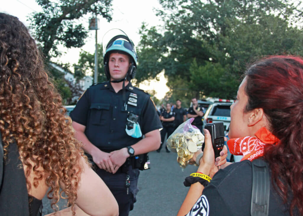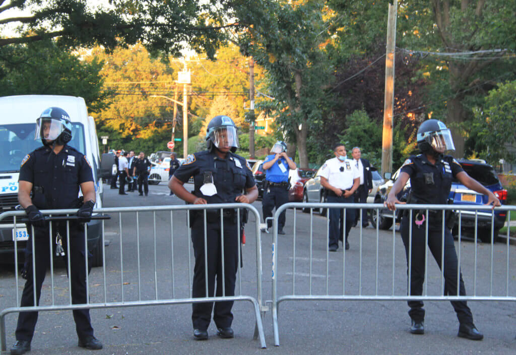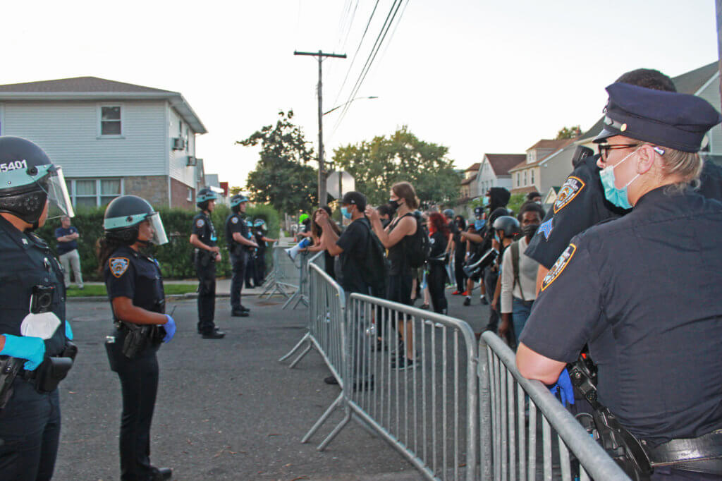 When marchers arrived to Lynch’s street, they were met with a barricaded block and more than two dozen officers, as well as PBA members behind the barricades and on the sidelines.