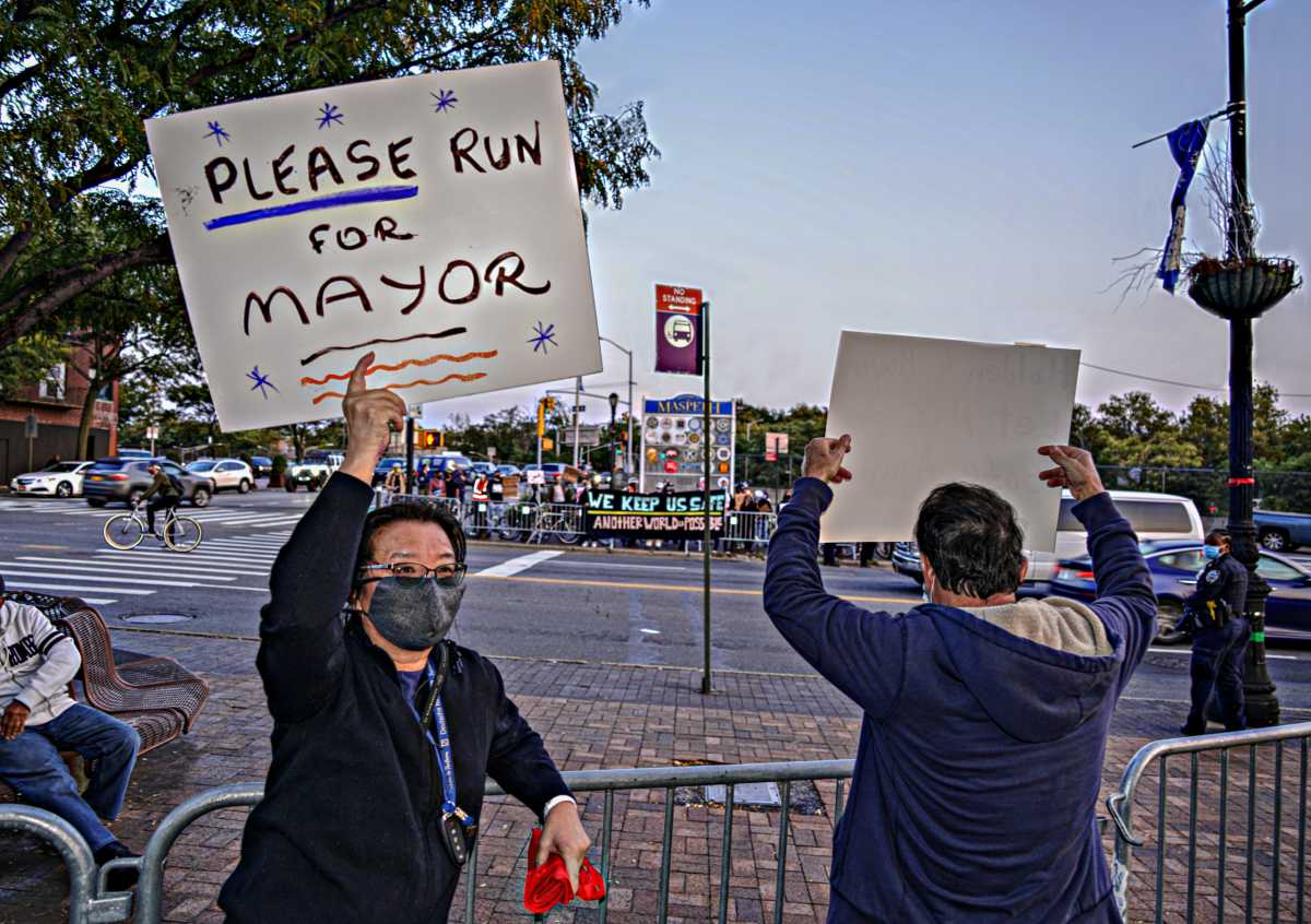 They held signs that read “Holden for Mayor,” “NYC Needs Real Leadership,” “Let NYC be safe again,” among others, urging the councilman to consider a run.