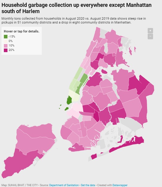 In 2020 through August, the department collected 4.2 percent more household garbage, recycling and organic waste than last year — with every borough except Manhattan driving the spike.