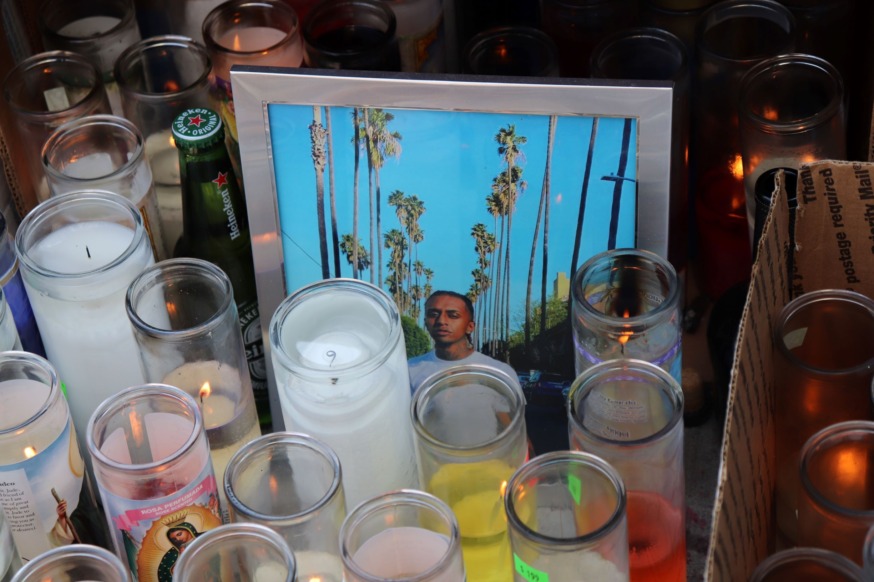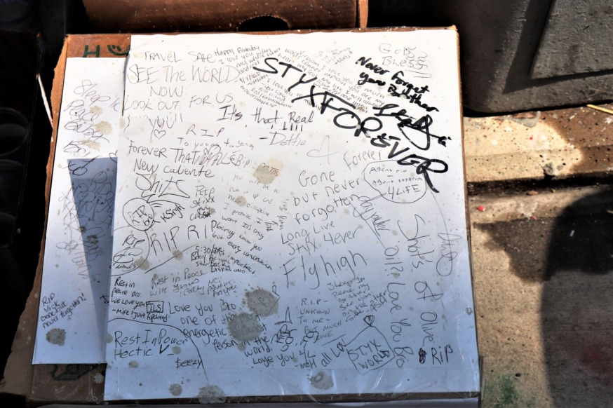 Messages like “never forget you brother,” “happy birthday,” and “sleep in peace my baby boy” are on sheets of paper taped to a box at the location.