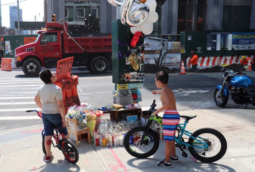 Two children at the memorial for Vickram Sewsankar, located at Borden Ave. and 2nd St. (Michael Dorgan, Queens Post)