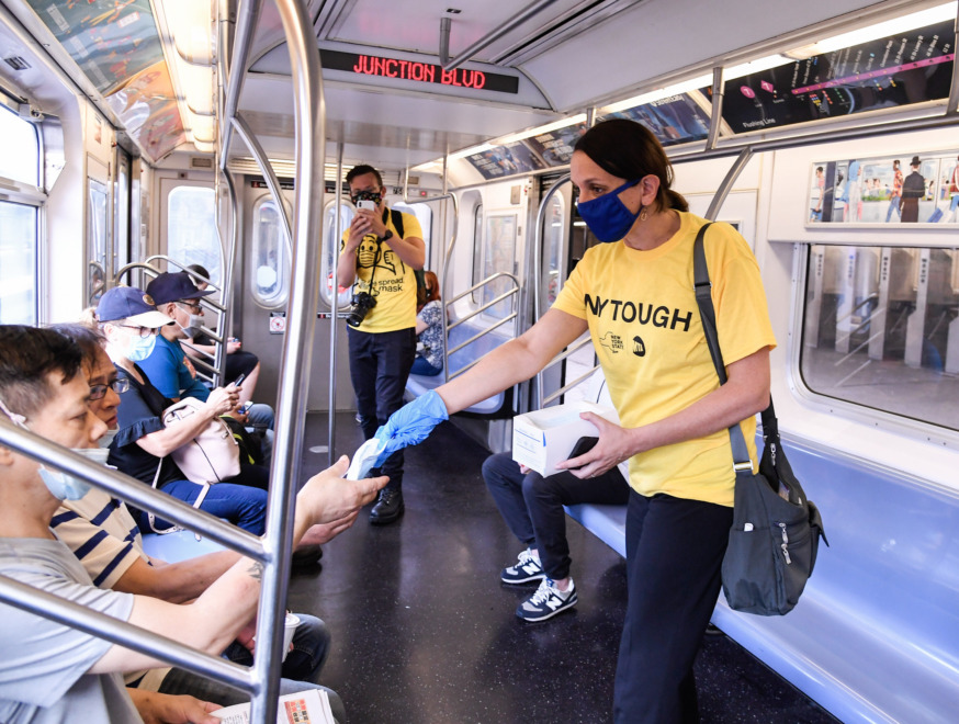 Riders without a mask can pick up a free one at subway station booth or from station ambassadors along the LIRR and Metro-North lines.