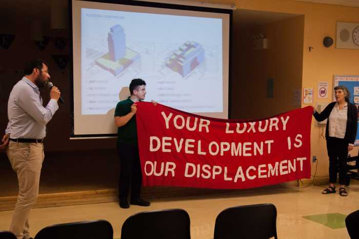 “Why should he and his neighbors get rest when Meir Babaev is causing our community to lose our sleep and our homes over the displacement his project will bring?” said Bonnie Gil, a leader with the RTU.