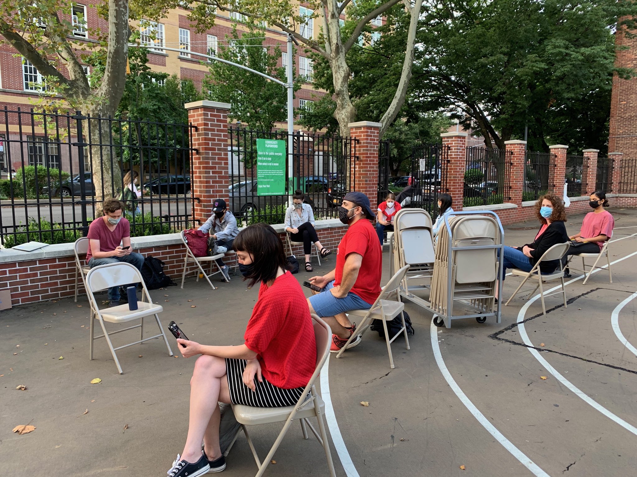 Teachers at I.S. 230 in Jackson Heights work in the schoolyard after a staffer tested positive for COVID-19 (UFT via Twitter)