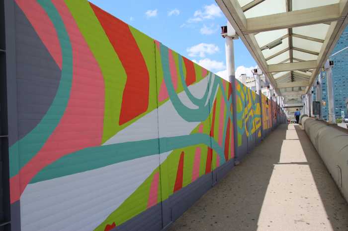 The mural’s design recalls her recent work at Governor’s Island, the Oculus, and Lincoln Center’s promenade in collaboration with the New York City Ballet.